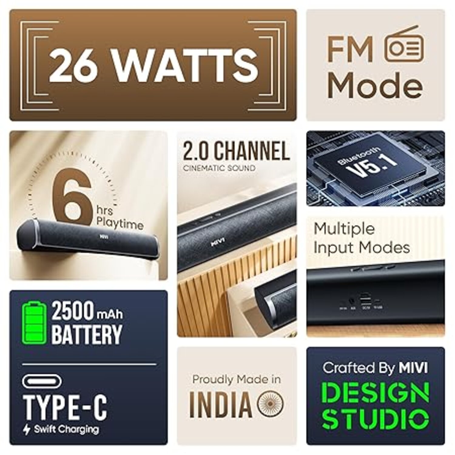 Mivi Speaker Maximum Output Power : 26 Watts Connectivity Technology : Bluetooth Audio Output Mode : Surround Mounting Type : Tabletop Mount About this item 1. Enjoy 26 watts of pure sound and unstoppable vibes. 2. The soundbar contains 2 in-built full-range speakers to offer the utmost aural clarity. These speakers for home make for a great audio experience. Enjoy booming sound and boundless freedom by bringing home your personal Home Theatre 2.0 channel with Bluetooth. 3. The high-grade premium fabric mesh blends in seamlessly with the Matt-finished back panel. It is ergonomically designed to be extremely lightweight and portable. 4. Mivi Fort R26 soundbar comes with a 2500mAh battery offering you up to 6 hours of playtime of a single charge. Enjoy absolute sound clarity on the go. 5. Connect the soundbar seamlessly via input modes. The soundbar offers 3 unique options to choose from including, USB, AUX, and Micro SD. It also comes with Bluetooth v5.1 for seamless wireless connectivity.